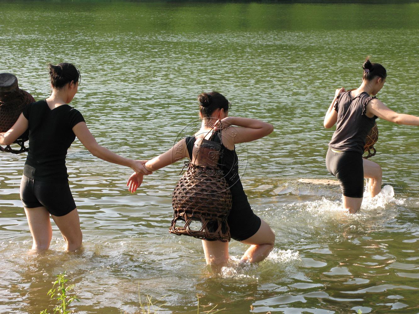 海南岛黎族是保留使用渡水葫芦最多的民族。渡水葫芦,古代便称之为腰舟,《歇冠子·学问篇》中记载“歇冠子曰‘中河失船,一壶千斤,贵贱无常’”。陆佃注曰:“壶,瓠也。佩之可济涉,南人谓之腰舟。”其中壶、瓠均指古时人们渡水所使用的葫芦,在古代船只贫乏的时期,渡水腰舟曾一壶千金。将葫芦系在腰间,便可增加渡水时的浮力,人们便可在水中轻松的畅游,故南方人称之为腰舟。在《诗·幽风·七月》中曾记载:“七月食瓜,八月断瓠”,葫芦不仅在嫩时可以供人们食用,同时在成熟之后因其容积大、体轻、防水性强、浮力大的特点还可以作为人们在水中畅游的浮具。