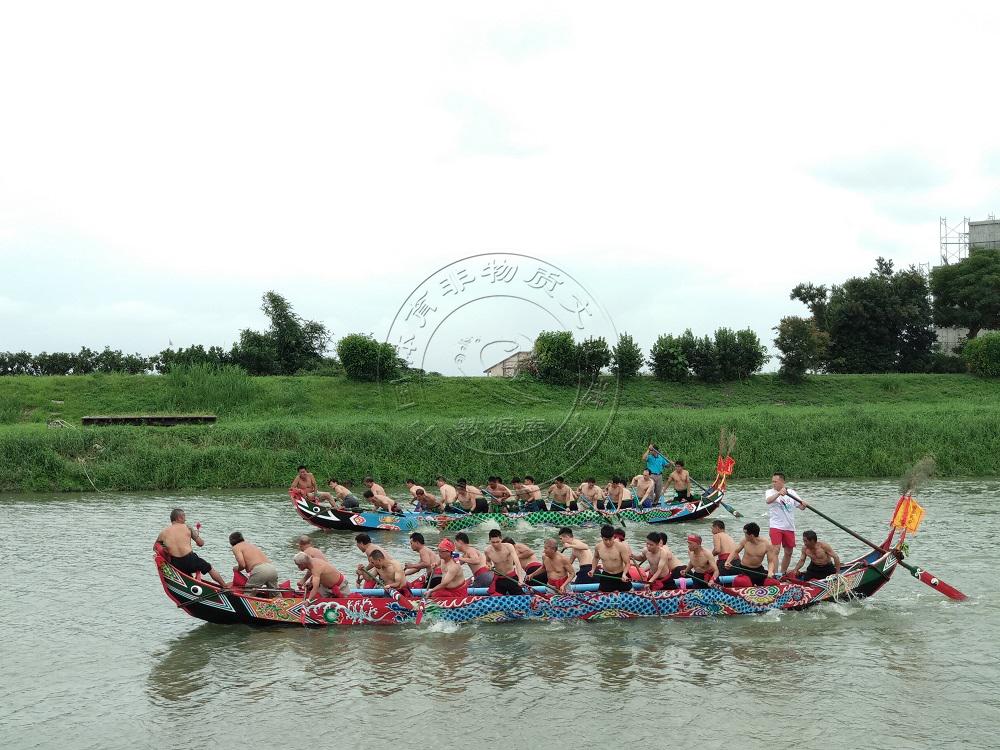 1、龙舟。二龙竞渡所使用的龙舟,与常见的龙舟不同,二龙竞渡的龙船除去彩绘部分,它更象是日常见到的小货船的造型。相传,这些龙船的前身,早年也确实为港口租借的货船,因而各时期龙舟的长、宽、高数据均有差异。目前所用龙舟为红桧木专门打造,长约10米,但依旧沿用当地货船造型,并有加入彩绘装饰。其彩绘装饰内容也很独特,有龙、祥云、花、双鱼图等元素,其船尾有两个分别写有“风调雨顺”和“国泰民安”的旗帜。综合来看,其彩绘装饰内容的目的在于驱邪镇妖以及祈福。除此之外,龙舟所用的划桨也很特别,淇武兰村持绿色桨,即阳极在上,而舟仔尾村持红色桨,即阴极在上。加之配合各自龙舟颜色搭配的细微差异,使两村龙舟对比十分鲜明美观。