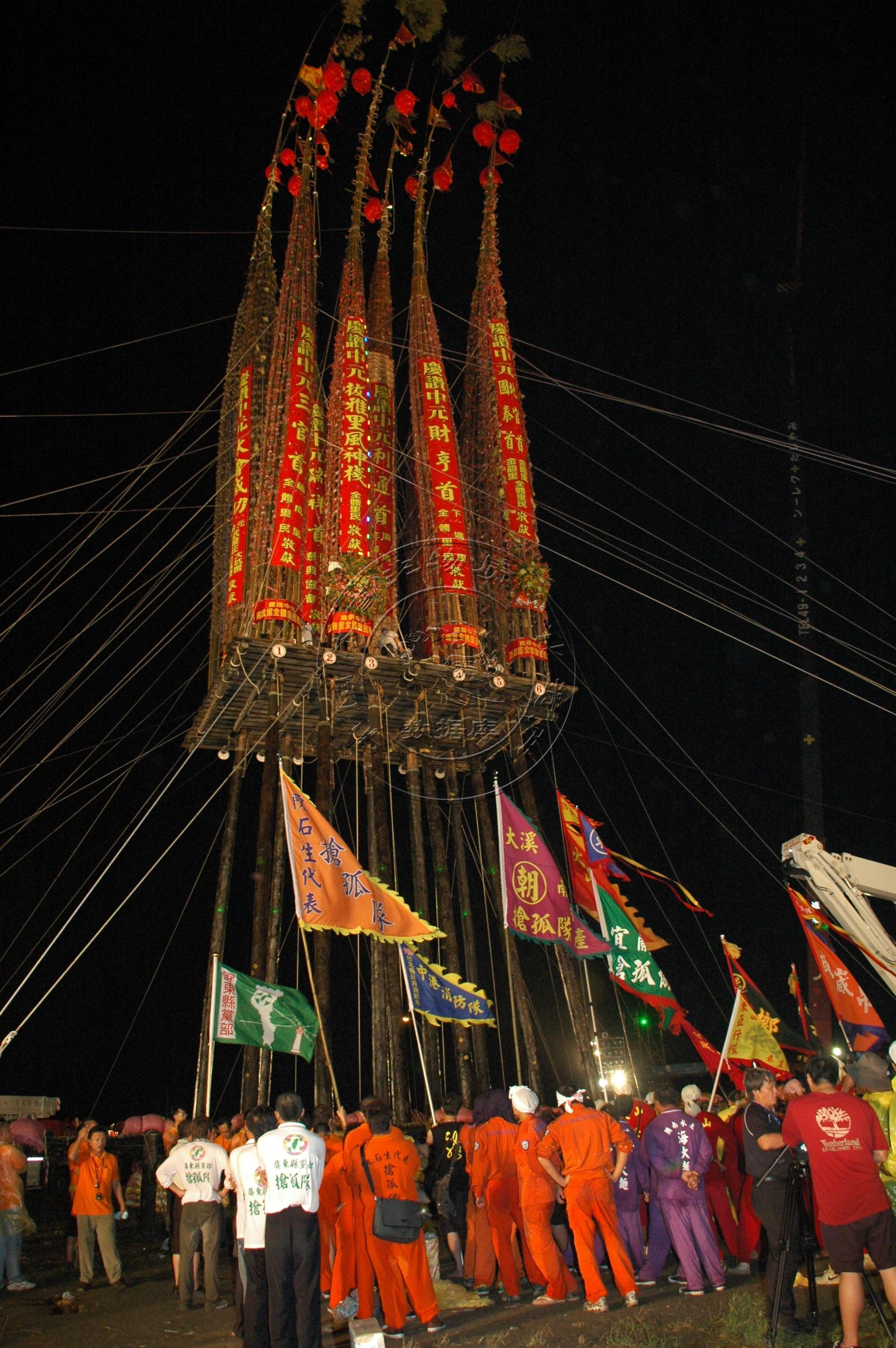 3.孤栈。位于整个孤棚的上半截,共有13座,每个均高达13米左右。孤栈由当地各社区分工完成,每个孤栈均由16根至少三年生,长达25米的竹尾东向的老刺竹配合其他竹子、铁箍、藤绳、碎木等编制搭建而成,完成框架编制后还会绑上当地八大庄及屠宰商等提供的祭品,包括猪肉、鸡肉、鸭肉、肉粽等祭品。