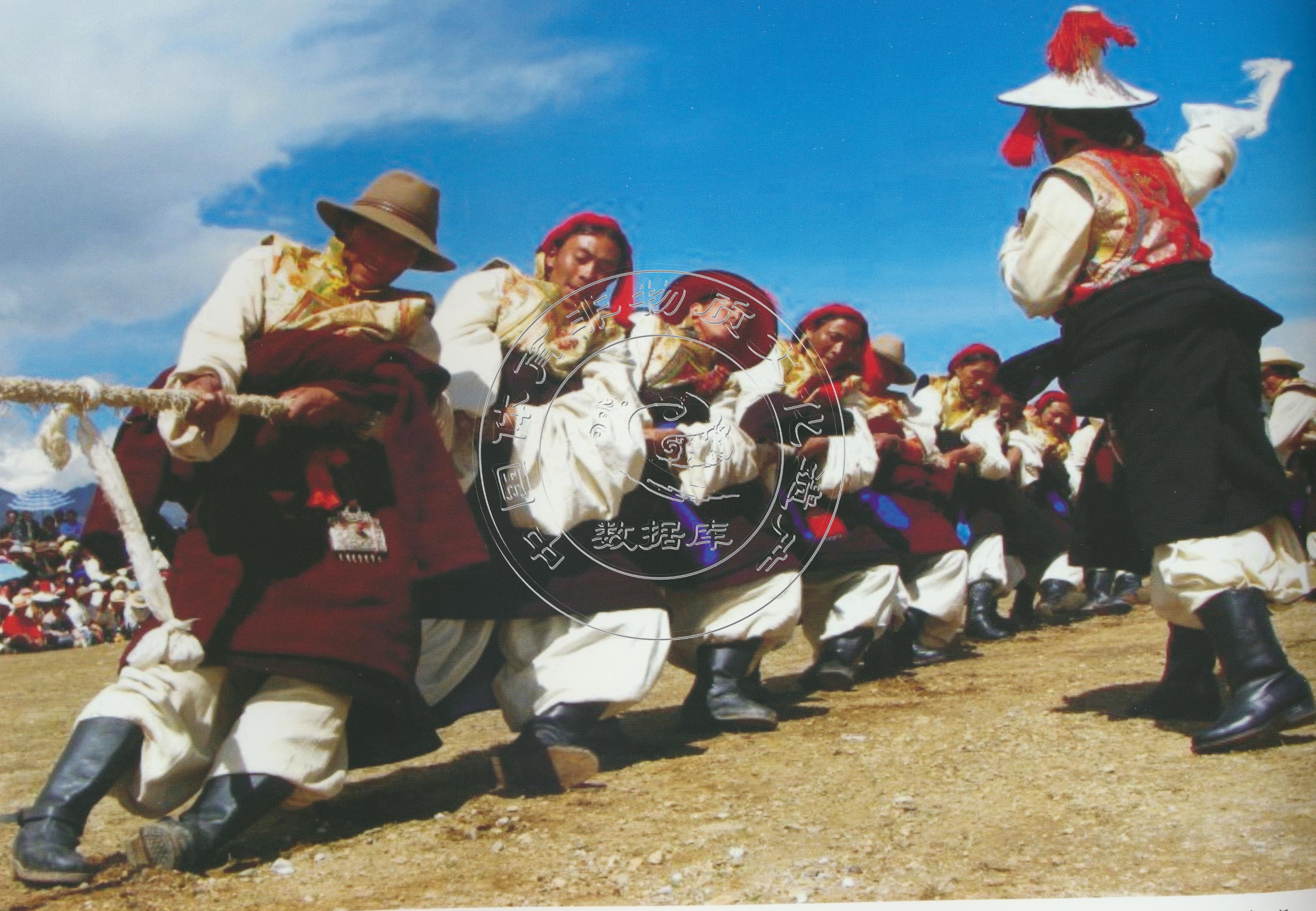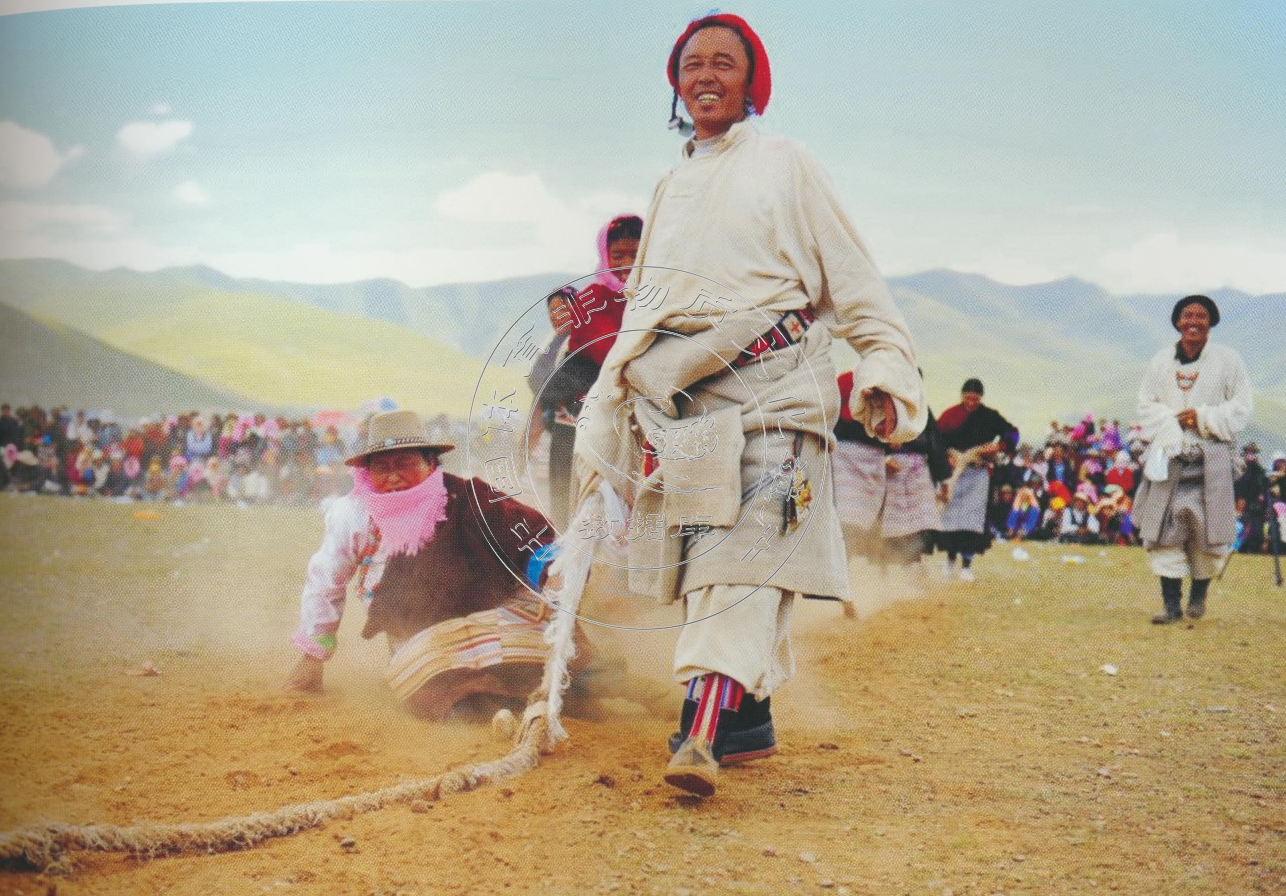 拔河:藏式拔河又称“押加”,即双方各执绳一端进行角力。先选出一块平地,并在地上划两条平行线作为河界,中央又划一条中界,准备一条长约4米的麻绳并用布带两端打结。比赛由两人进行,双方各自把绳子套在脖子上,两人相背,将赛绳经过腹胸部从裆下穿过,然后趴下,双手着地,赛绳拉直,绳子中间系一红布为标志,垂直于中界。听到比赛开始的口令后,两人用力互拉前爬(爬拉动作模拟大象)。用腿腰肩颈的力量拖动布带奋力向前爬,以将红布标志拉过河界者为胜。