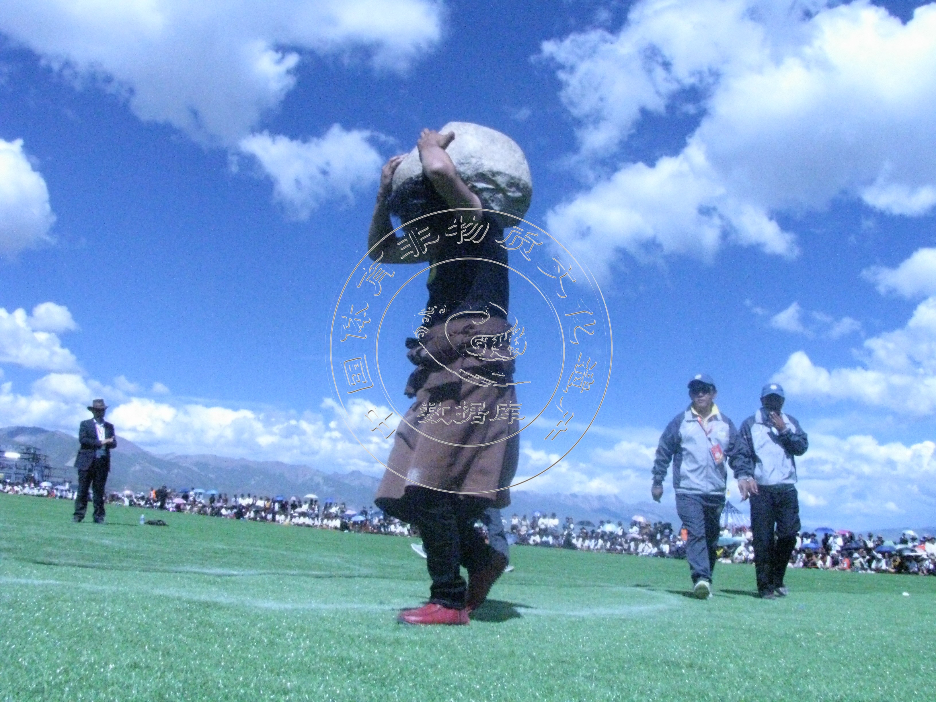 藏式举重:分为 “朵加”与“角乎”两类形式。藏语“朵加”意即抱石头,“角乎”意指举皮袋。参加者用双手先将石头抱至胸前,然后将石头从腋下移放背上,能背石头绕规定范围走一圈而石头不落下者为胜。亦有将石抱起后向前或从肩部向后抛者,以投掷出的距离远近决定胜负。