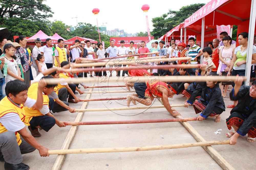 黎族打柴舞是崖州区黎族村落一直流传的一种群体性活动,参与人数众多,参与者需要在击打竹竿的间隙中寻找一定的规律,不断地躲避竹竿的击打并跳出形态各异的优美舞步。