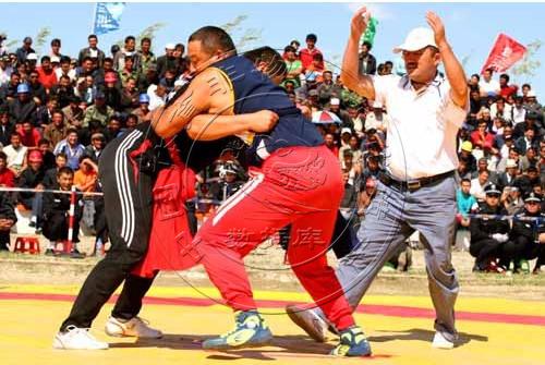 比赛前,双方都会高唱挑战歌以助声势,唱三遍后,双方摔跤手跳跃而出,做着雄鹰展翅的舞姿进入会场。比赛开始,摔跤的双方互相致意和向观众敬礼后,开始架起姿势准备一较高下。顷刻间,选手争斗相扑,盘旋相持,腿膝相击。