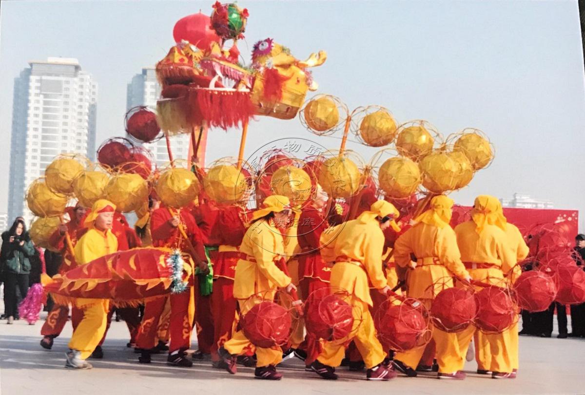 戎官营绣球龙灯的历史,从师承关系上,只能推算到清同治年间的王老印(1846-1919)。但据原孙村娘娘宫内有一幢明朝万历九年(1581年)立的《重修娘娘宫碑记》,在施主栏内,有戎官营“云龙圣会”会首戎轩的铭文。这说明早在400多年前,戎官营就有了绣球龙灯。