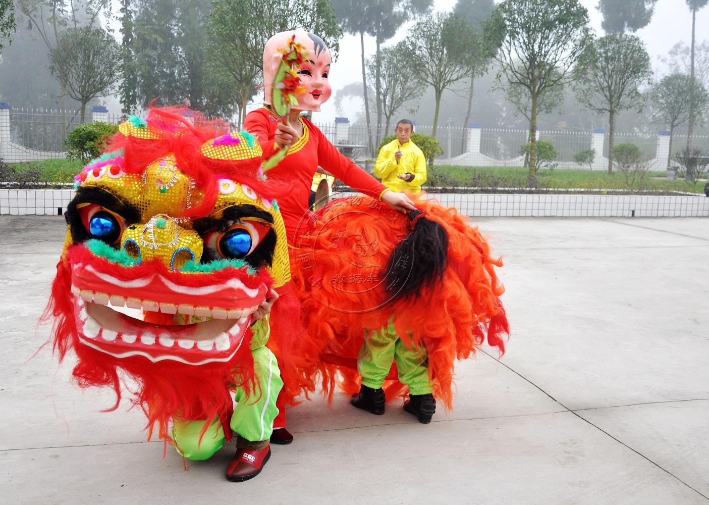狮子由两人扮演分别扮狮头和狮尾,二人也是穿一套绿色衣服,脚穿布鞋,两人身披狮皮,玩狮头需人在前,玩狮尾的人双手抓住前者的腰带,如需晃动狮尾巴,则空出一手摇晃系在里面的竹杆。表演时,要求二人配合默契,协调一致,走跑跳跃,并要充分模拟狮子的特征动作,如摇头、舔腿、舔胯、打滚、翻皮等。