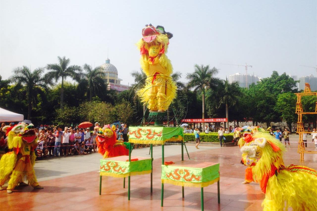 “楼台跳桩”是由三张八仙桌叠成的一个楼台,顶端安装四根桩,一头雄狮在引狮人的引诱下,以凶猛敏捷的姿态跃上桩顶,并展现各种高难度动作让观众大饱眼福。
