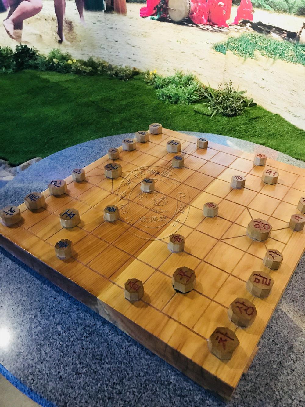 棋子面分为红黑两组,字体和圆框应当醒目。棋子大小规格不同,其中,士、兵、卒尺寸小,车、包、马、象尺寸大,漢楚尺寸特大。