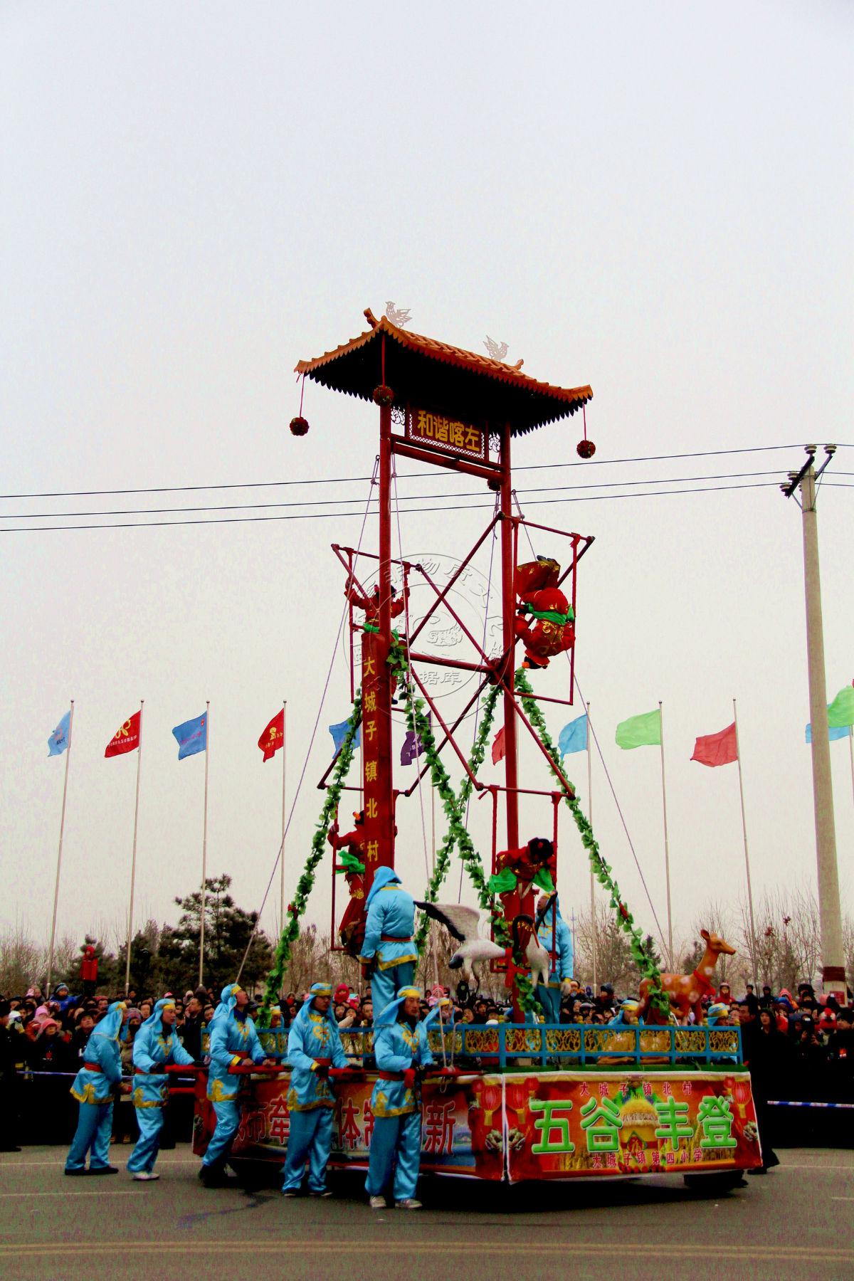 二是见于1980年《喀左文艺》1-2期合刊,刘新民撰写的《天成观与大城子皇会》文中记载:“第五道会秋千由农民筹办,该会的形式是,二十人抬一平架,中部分左右并列竖起两根两丈余高的朱红立柱,立柱顶端,设有横轴,轴分四面出两根并列长齿,侧面看呈十字形。两长齿顶部又通一横轴,轴上固定一长方形木框,木框的两个长边的中部,又横穿一轴。表演者均为十几岁的少女,头挽双髻,戴着人字形绒球面额,身着彩服,足穿弓鞋,鞋尖上有用布包制的大蝴蝶。表演者腰以彩带束在长方形木框轴上。表演时拨动长齿按着一个方向转动,带动长方木框上下左右翻动,表演者在木框内进行前后滚翻。平架上前部设有假山,左右各有一小童,头挽双髻后发披肩,从额头到脑后有一束发银圈,额头上别一人字英雄面,额顶端有一大红球;左为粉面素裹,骑在仙鹤背上,手持一束鲜花;右为粉面花衣,骑在梅花鹿上,手拿如玉。假山前有一横匾上书“万善同归”四字。平架后部,两角各有一束莲花,中间有一条红色大鲤鱼,并有用纸扎的各种谷物,表现为丰收景象,己失传。”