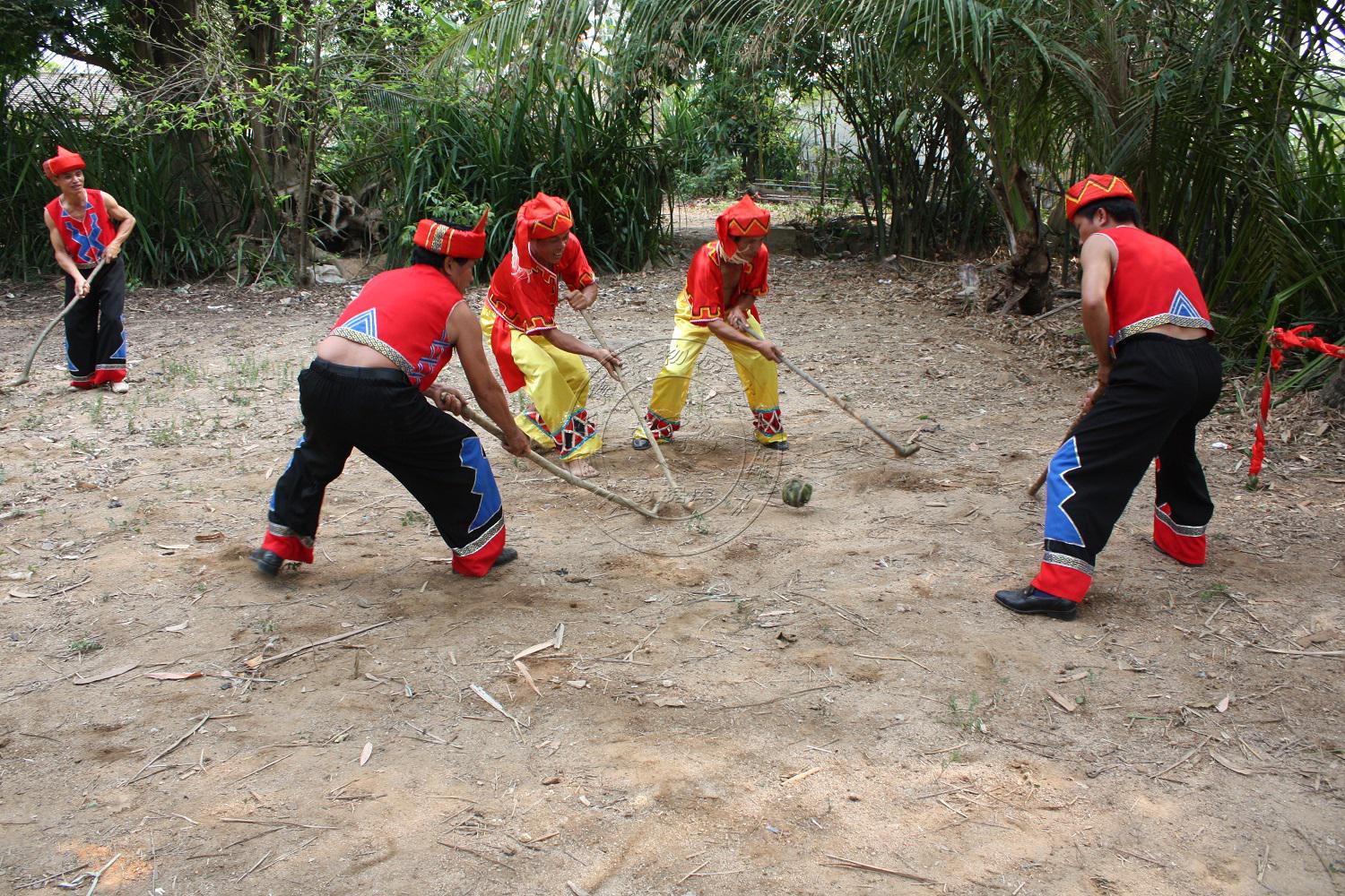 流行在黎族民间的赶狗归坡比赛,其赛场的大小因地制宜,比赛的人数也没有固定限制,通常每队各有5名球员。比赛前,将比赛用的圆球放置在场地的中心,在裁判员发令之后,两队便可用球棒争抢圆球,哪一队能将圆球击打到对方的球门即可获得1分。赶狗归坡的比赛时间是由两队之间协商确定的,在规定的时间内得分多的队伍即为胜利的一方。输掉比赛的一方则要背着胜利一方的球员爬着离场,以示惩罚,胜利的一方则会挥舞球棍欢呼离场。
