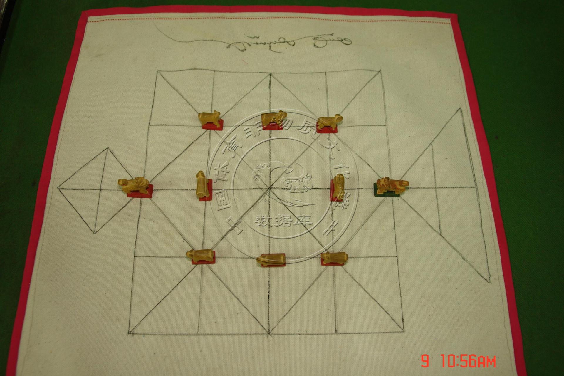 蒙古鹿棋作为蒙古族最早开创的民间棋类项目之一,是蒙古族特有的古老项目,其项目规则也有多种,现在流传于内蒙古西部地区的鹿棋共有4种玩法。四种玩法中最普遍的一种玩法,棋子是由24只“羊”和2只“狼”组成有;另一种玩法是由96只“羊”和8只“狼”组成的4个“耳洞”的大鹿棋;第三种玩法是由2只“羊”和1只“狼”组成的小鹿棋;最后一种是3只“羊”的3人鹿棋。除了第一种鹿棋以外,大小鹿棋的玩法目前已经很少有人知道了。