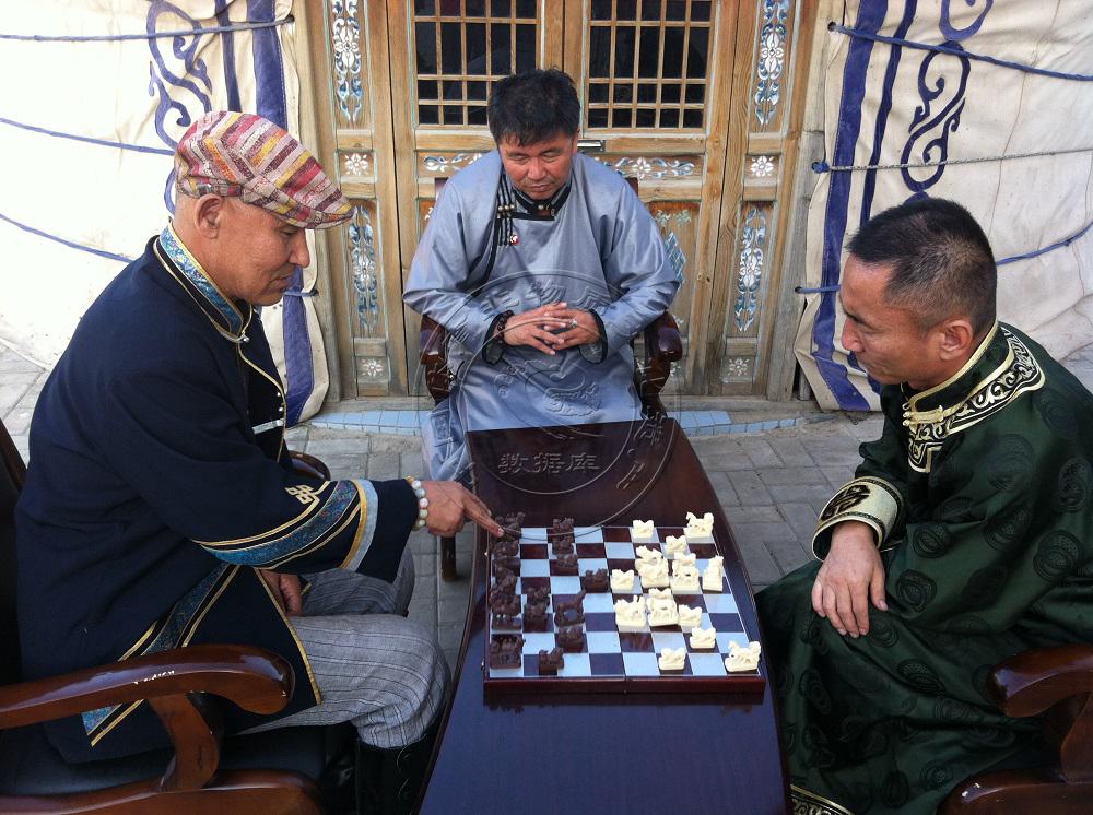 蒙古族象棋是蒙古族传统棋牌文化的代表,是北方蒙古高原民族在长期流动和征战游牧生活中形成最具代表性的棋类游戏之一。蒙古象棋蒙古语为“夏特尔”,是战场上先锋部队中“精兵”的意思,其产生年代可追溯到元代蒙古王朝兴盛时期。蒙古象棋由王、后、骆驼、马、车、卒组成,可用铜、宝石、木材等材料雕刻制成;棋盘由六十四个黑白相间的四方格组成,蒙古语称为“白勒迪尔”。蒙古象棋有着悠久的历史,但现存文字记载很少,它在历史的长河中并没有形成固定的定制,具有较强的灵活性。蒙古象棋的悠久传承主要是通过先辈的口头传承和生活中的日积月累流传下来的,其精巧的手工雕刻工艺和整套的棋艺布局都是现今民族文化中十分珍贵的实物资料。